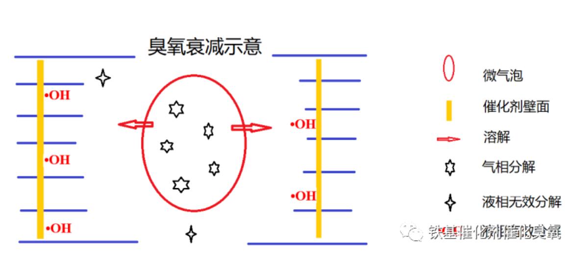 臭氧液相溶解與衰減:影響因素相互交叉,比較復雜。如紊動,既可增強溶解、又可強化衰減,而衰減包括有效分解和無解分解。三過程對反應器工況影響巨大,簡單地想象一下:若溶解慢,大部分臭氧被氣泡攜帶,則在池上部的分布多;若溶解快,大部分臭氧被水流攜帶,若氣液逆向流,則在池下部的分布多。若無效分解比有效分解慢得多,催化劑填料高度小些也問題不大;若兩種分解速率差不多,催化劑填料不僅高度要大,而且在池中位置影響很大。因此,反應器的優化,包括:臭氧布氣器形式(氣泡大?。⑹欠駳庖耗嫦蛄鳌⒋呋瘎﹨^域高度和位置等,都依賴于臭氧溶解與分解動力學的建立。