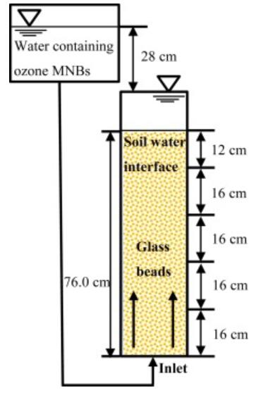 在內(nèi)徑為12 cm 的有機玻璃圓筒(圖1)中進行了柱測試, 以研究臭氧MNB處理受有機物污染的地下水。將玻璃珠與甲基橙溶液以10 mg / L的初始濃度混合,以模擬被有機物污染的土壤和地下水。的比重的玻璃珠是2.43,平均直徑為60微米,干密度為1.43 克/厘米3 。的水力傳導率為1.3 × 10 -4米/秒,因為玻璃珠進行分級很差,其表示介質(zhì)的沙子。土壤樣品的高度為76 分別在距底部16 厘米,32 厘米,48 厘米和64 厘米處分布有4個采樣口#1,#2,#3和#4 。去離子水中不斷產(chǎn)生臭氧MNB,以確保臭氧MNB的數(shù)量保持在峰值。含有臭氧的MNB的水從底部以0.368 的水力梯度i向上供入塔中。不使用MNB的去離子水用于對比測試。每個測試進行兩次以確保數(shù)據(jù)的可重復性。