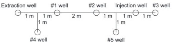 一臺抽采井,一臺注入井和五個監(jiān)控井(其位置如圖2所示)用于原位修復。 很初的地下水流向是從注入井到提取井。每個井的深度為16 m,篩選間隔為12 m至16 m。提取井的直徑為25 cm,將提取速率為36 L / min 的泵放置在井內(nèi)15 m 的深度處。注入井和監(jiān)測井的直徑為5 厘米。注入井與注入單元相連,注入率為15 升/分鐘 由于注入速率受場地和設施條件的限制,因此采用了較高的抽取速率以產(chǎn)生更強的地下水流。處理殘留的水并將其排放到遠離測試區(qū)域的地方。在監(jiān)測井中安裝了地下水采樣器,以收集15 m 深度的樣品。