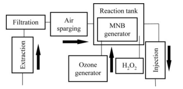 開發(fā)了現(xiàn)場修復設備(圖3 )用于現(xiàn)場測試。修復系統(tǒng)包含三個部分:提取單元,反應單元和注射單元。從該地點提取受污染的地下水,并進行過濾以除去土壤顆粒。過濾后,用空氣噴射裝置處理地下水以除去三氯乙烯。隨后,將處理過的地下水注入到反應罐中。MNB發(fā)生器位于水箱內(nèi)部,用于原位產(chǎn)生臭氧MNB。在產(chǎn)生臭氧MNB的過程中,以1∶1的臭氧∶H 2 O 2的質(zhì)量比添加H 2 O 2試劑。臭氧MNB和H 2 O之后添加2份水,通過注入單元將水注入地面。從反應罐到進樣單元的流量為15 L / min,停留時間為33.3 min,以實現(xiàn) 很佳的MNB生成。從當?shù)貢r間每天09:00到18:00進行了六天的原位地下水修復。對地下水進行采樣以監(jiān)測三氯乙烯的濃度。