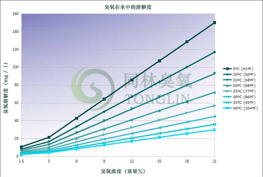 下表顯示了基于水溫和臭氧濃度的臭氧在水中的溶解度(以重量%表示)。這些是業內 很常用的值,并提供了一個簡單的參考工具。