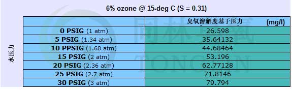 下表顯示了臭氧溶解度的壓差。臭氧濃度為6重量%,水溫為15℃。根據水壓計算臭氧溶解度的差異。