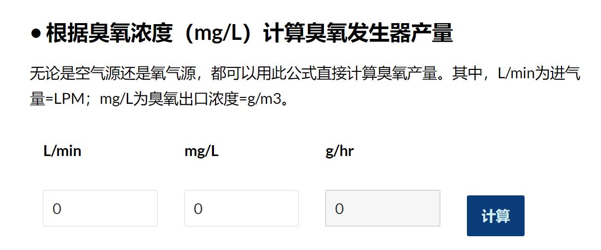 下面是同林開發的一款在線計算工具,輸入氣量和濃度,直接可以得出臭氧產量。