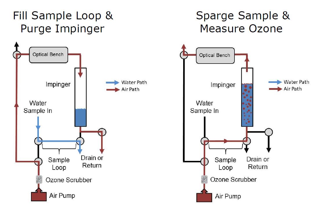 圖 1是水臭氧監測儀的示意圖。四個 2 通閥和一個 1 通閥引導空氣和水流通過設備。測量溶解臭氧的過程包括兩個步驟。在第一步(圖 1 的左圖)中,樣品環中充滿了來自待分析水源的加壓水流,內部空氣泵對撞擊器加壓以清空前一個樣品中的臭氧消耗水.在第二步中,改變閥門狀態,使來自空氣泵/洗滌器的不含臭氧的空氣都將約 2 mL 水樣推入沖擊器并噴射樣品,富含臭氧的空氣通過光具座,其中臭氧被測量。每個步驟大約需要 5 秒,每 10 秒報告一次新的臭氧測量值。