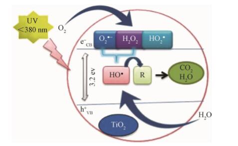 光催化氧化法是在光化學(xué)氧化基礎(chǔ)上逐漸發(fā)展起來的一種新興的高級(jí)氧化技術(shù),這種方法簡(jiǎn)單高效,在有機(jī)物的降解方面效果更好。TiO2由于具有穩(wěn)定性好、活性高和無毒性等優(yōu)點(diǎn),成為目前應(yīng)用 很廣泛的催化劑,圖1為二氧化鈦光催化原理示意圖。