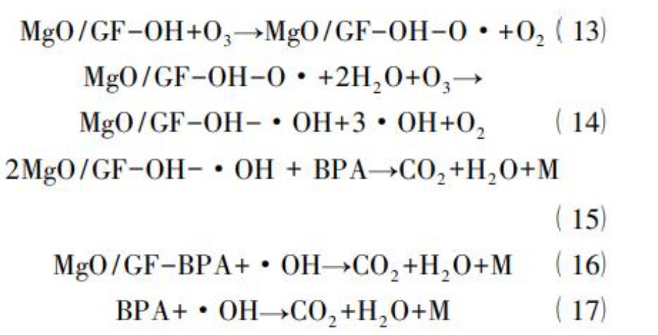 Zhang等利用高比表面積、可折疊的石墨氈(GF)為載體,采用等體積浸漬法制備了MgO/GF催化劑。在中性條件下降解雙酚A(BPA)的過程中發(fā)現(xiàn),與單獨(dú)臭氧化過程相比,加入MgO/GF催化劑可以使BPA和COD的去除率分別增加40.0%和31.6%。通過加入羥基自由基猝滅劑———叔丁醇,間接證明了MgO/GF/O3體系主要遵循羥基自由基的反應(yīng)機(jī)理。同時(shí)對(duì)反應(yīng)過程中溶解臭氧濃度進(jìn)行檢測(cè),發(fā)現(xiàn)加入催化劑后溶液中的臭氧濃度始終處于較低水平。因此,作者認(rèn)為MgO/GF可以提高臭氧化效率的原因主要是催化劑表面的堿性位可以促進(jìn)臭氧分解產(chǎn)生·OH,如下述方程式所述。