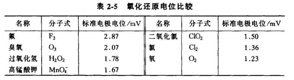 從表2-5可知,臭氧的標(biāo)準(zhǔn)電極電位除比氟低之外,比氧、氯、二氧化氯及高錳酸鉀等氧化劑都高。說明臭氧是常用氧化劑中氧化能力 很強的。同時,臭氧反應(yīng)后的生成物是氧氣,所以臭氧是高效的無二次污染的氧化劑。